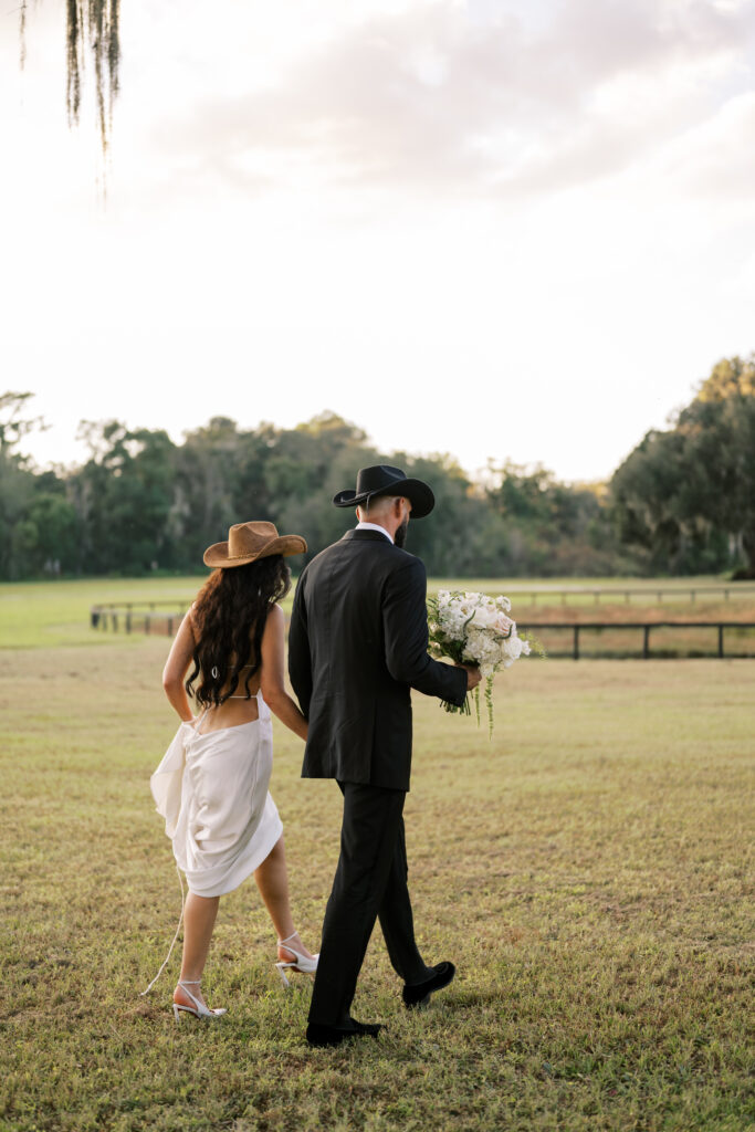 The bride’s minimalist satin gown, styled with a Western hat and undone waves, exuded quiet confidence—equal parts grace and grit. Her look captured the heart of the shoot: contemporary romance with a hint of rebellion.