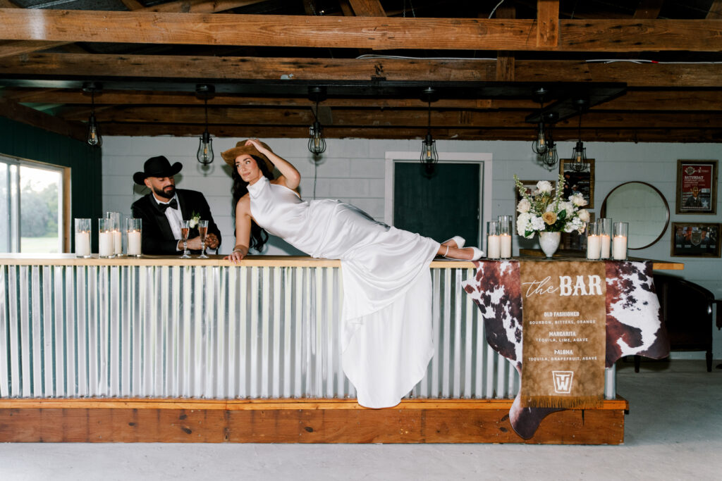 Inside the barn, the energy shifted. The corrugated metal bar—anchored by a custom cowhide runner—set the mood for something playful and cinematic. The bride lounged effortlessly across the bar, champagne in hand, surrounded by candlelight and florals by Westover’s Flowers.