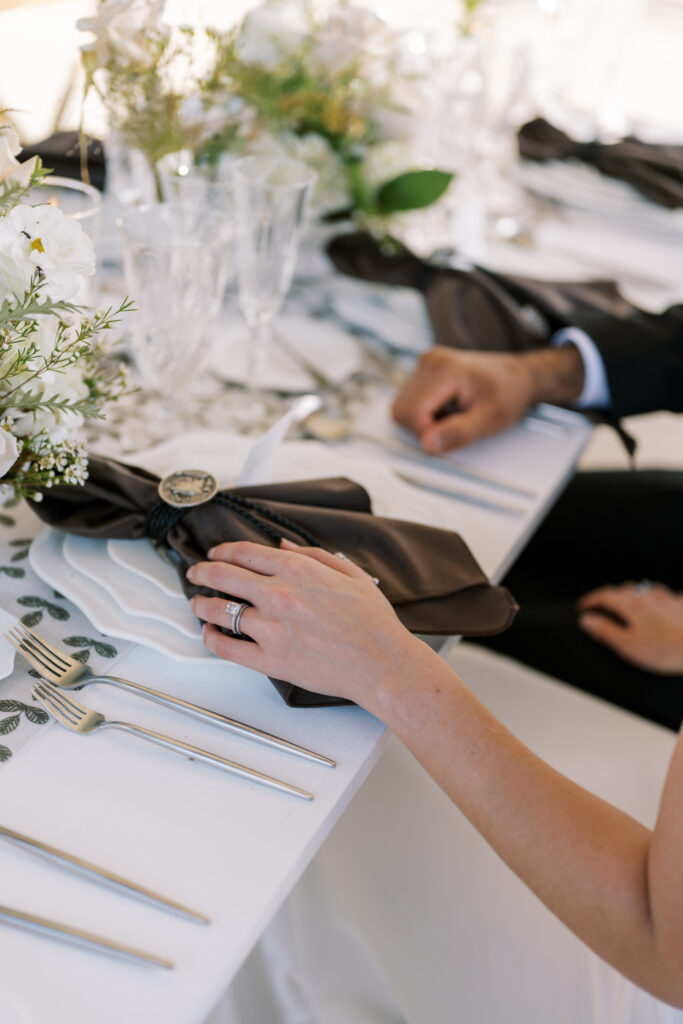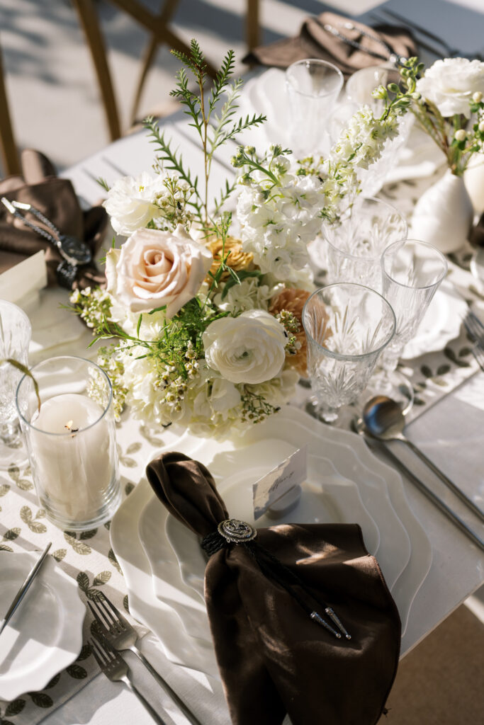 Helena Elizabeth Events layered organic texture with modern structure, pairing warm caramel accents and dark, grounding tones against crisp whites and soft greenery.