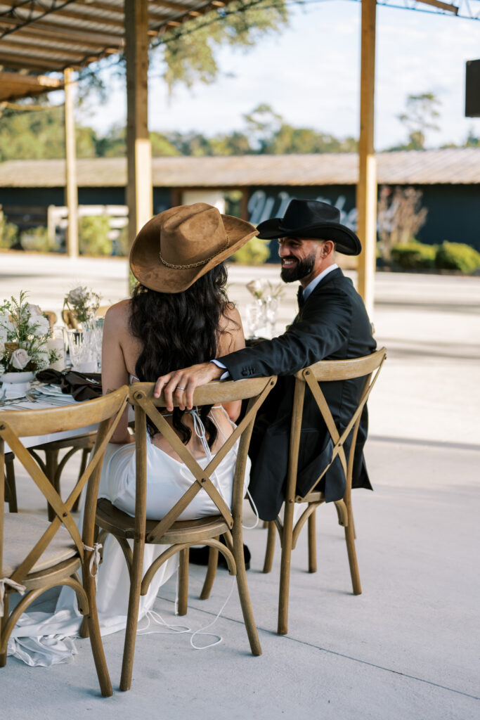 The groom’s black tux and cowboy hat echoed the theme—classic with a Western nod, creating a seamless pairing of old and new.